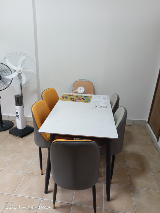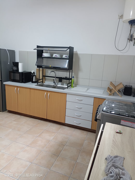 Cuisine aménagée d'un plan de travail équipée d'un évier en inox 2 bacs 2 égouttoirs, d'un réfrigérateur, d'un micro-ondes, d'un moulinex, d'une bouilloire électrique, des placards bas, d'une cafetière, d'une cuisinière à gaz à 4 foyers, d'un fer et planche à repasser, d'un ventilateur, d'eau chaude, d'une table des ustensiles de cuisine tels que : Des autocuiseurs ou cocottes-minute, des plats (cassables et en plastiques), des assiettes, des petites bassines plastiques, des Grandes et petites cuillères, des fourchettes, des couteaux ( couteaux de cuisine et couteaux de table), des verres de table (verres à eau, verres à vins ...), des tasses à café et à thé, des gobelets en plastique, d'un grattoir.